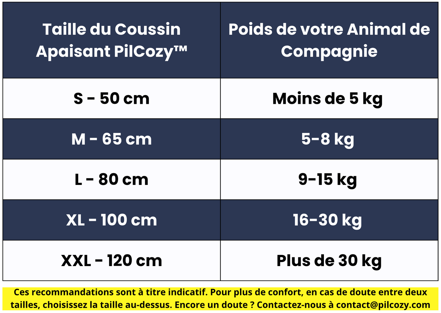 Bien que notre guide des tailles aide la plupart des clients, chaque animal est unique. Si le lit est trop étroit ou trop spacieux, nous proposons une politique d'échange simple pour garantir le confort de votre animal. Contactez-nous à contact@pilcozy.com, et nous nous occupons du reste !
