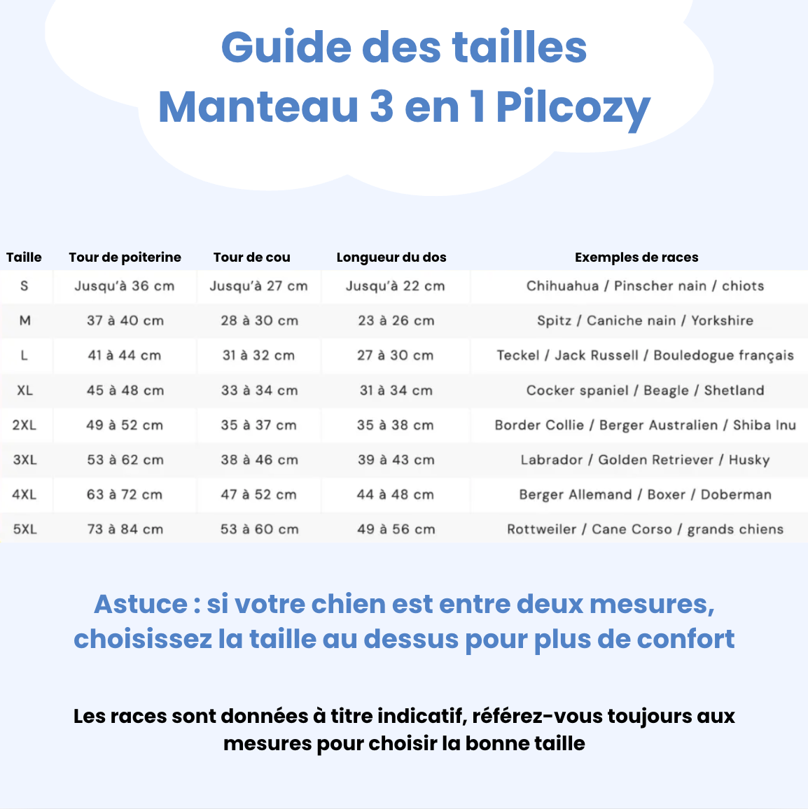 👉 Si votre chien se situe entre deux tailles, choisissez toujours la taille supérieure pour un ajustement plus confortable.